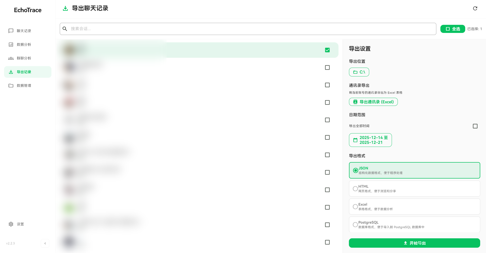 - 选择会话:勾选你想要导出的好友或群聊(支持顶部搜索)。